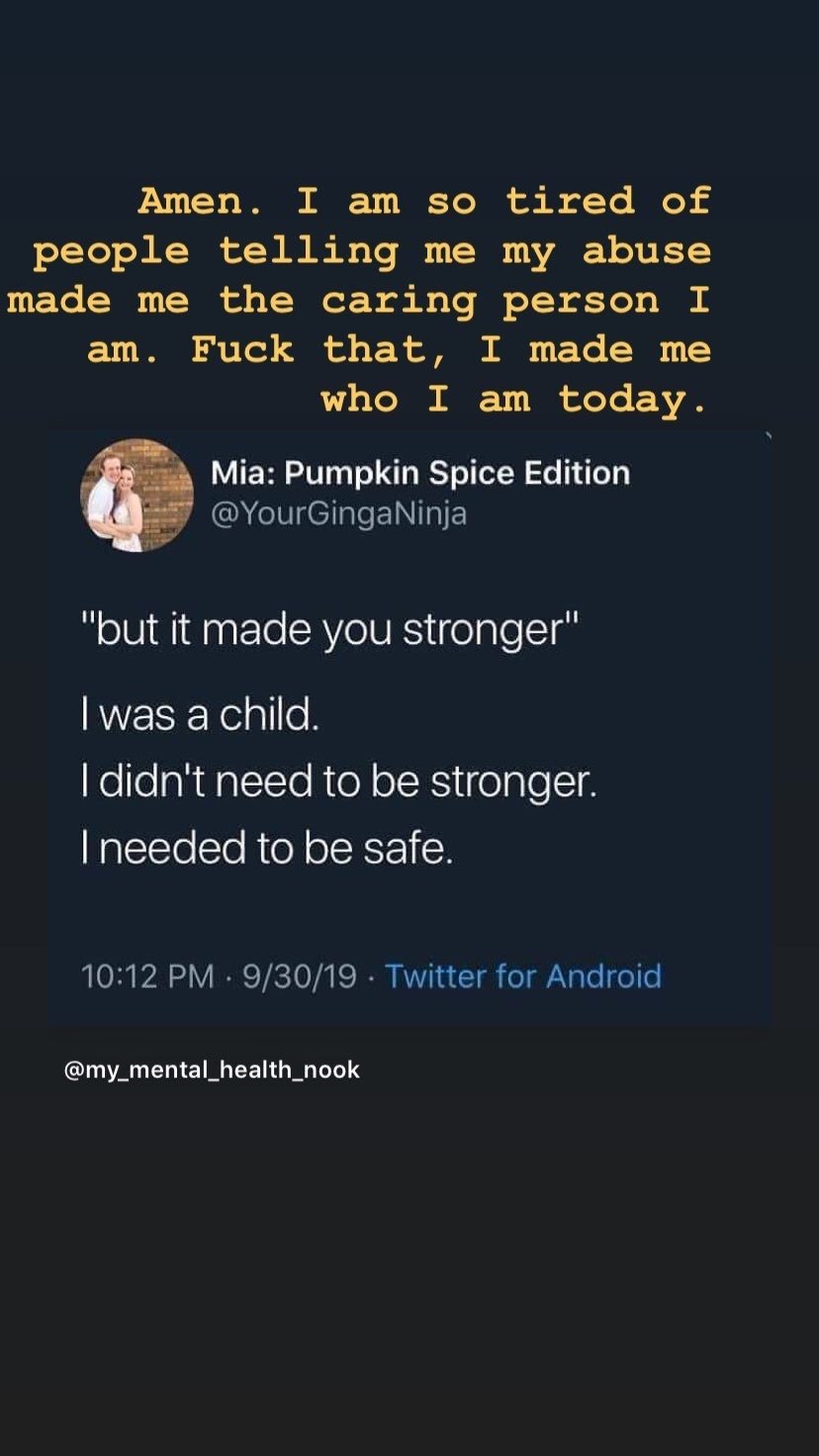I don’t want to hear about how the universe deserves credit for pushing us to that, we deserve ALL of the credit for getting there, despite everything the “universe” threw at us. Every single survivor out there deserves ALL of the credit for simply being here, despite what happened to us, and every single survivor who is not here deserves NONE of the blame for what the abuse did to them.